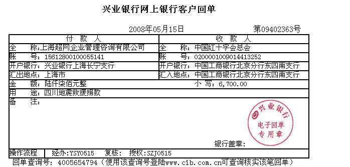 5月15日,上海超网已将筹集到的第一笔捐款共6700元汇到中国红十字总会的账户上。
