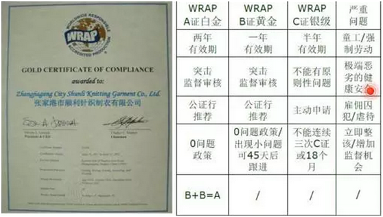 二是WRAP标准相对而言比较人性化,讲究规范透明,只要软件的管理上去,其实整改的投入并不多,不像沃尔玛要求喷淋要么装起来费用不得了要么根本无法装。